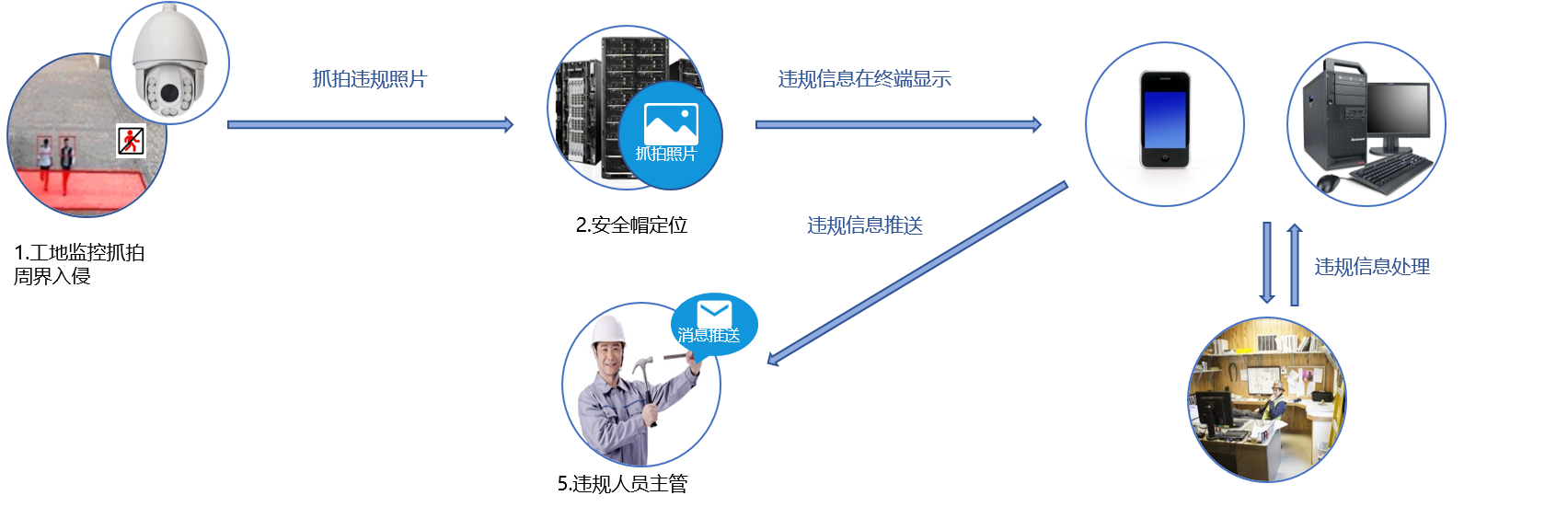 采用特定目標(biāo)檢測技術(shù),檢測識別施工圍欄警示標(biāo)志和電子周界,進(jìn)而實現(xiàn)施工作業(yè)區(qū)域識別預(yù)警,同時夜晚可以檢測施工現(xiàn)場材料區(qū)域,發(fā)現(xiàn)有可以目標(biāo)進(jìn)入檢測區(qū)域可實時預(yù)警。自動智能抓拍,彈出報警和聲光電報警。