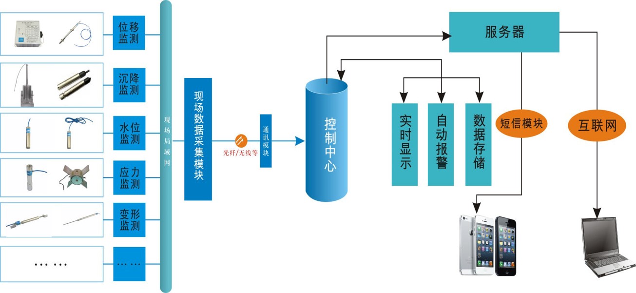 通過安裝傳感器與傳輸裝置對支護結(jié)構(gòu)、地表沉降、圍護樁傾斜等實時在線監(jiān)測,實時掌握建筑基坑的結(jié)構(gòu)變化。建立多級報警機制,發(fā)現(xiàn)監(jiān)測數(shù)據(jù)異常時即時向用戶推送報警通知,監(jiān)測結(jié)果進行實時顯示發(fā)布,并定期向用戶推送監(jiān)測報表,從專家系統(tǒng)中提取處理辦法采取措施介入,對基坑施工期的監(jiān)測數(shù)據(jù)分析與安全評估,實現(xiàn)結(jié)構(gòu)穩(wěn)定性趨勢分析。