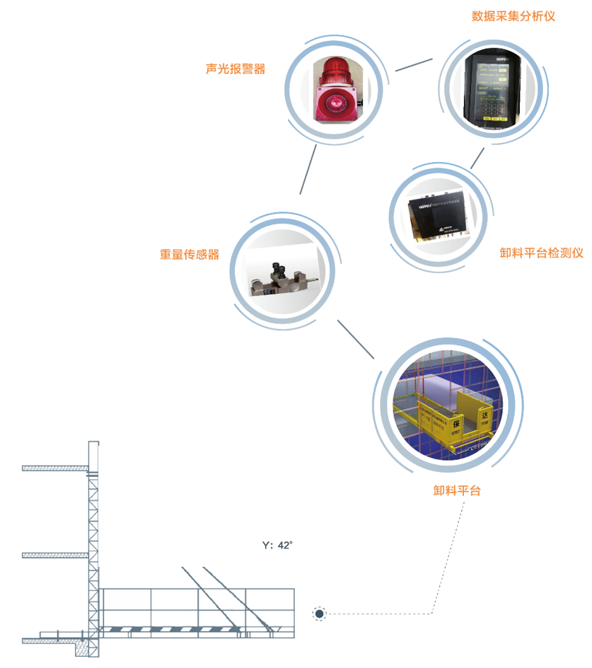 通過對卸料平臺載荷等相關(guān)情況監(jiān)測管理,重量傳感器實時進行運行過程的監(jiān)控,超超載進行報警,并將在中數(shù)據(jù)傳輸?shù)狡脚_通知相關(guān)負責(zé)人。平臺附近安裝聲光報警器,第一時間進行現(xiàn)場報警,避免可能發(fā)生的傾覆和墜落等事故。