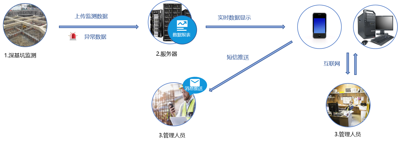 通過安裝傳感器與傳輸裝置對支護結(jié)構(gòu)、地表沉降、圍護樁傾斜等實時在線監(jiān)測,實時掌握建筑基坑的結(jié)構(gòu)變化。建立多級報警機制,發(fā)現(xiàn)監(jiān)測數(shù)據(jù)異常時即時向用戶推送報警通知,監(jiān)測結(jié)果進行實時顯示發(fā)布,并定期向用戶推送監(jiān)測報表,從專家系統(tǒng)中提取處理辦法采取措施介入,對基坑施工期的監(jiān)測數(shù)據(jù)分析與安全評估,實現(xiàn)結(jié)構(gòu)穩(wěn)定性趨勢分析。