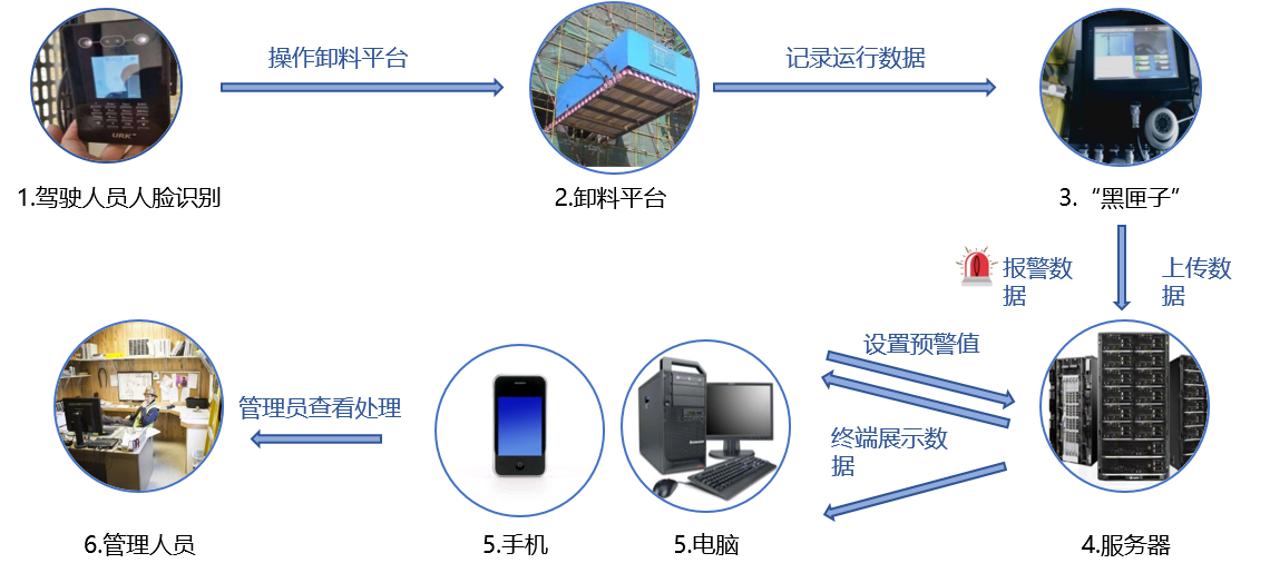 通過對卸料平臺載荷等相關(guān)情況監(jiān)測管理,重量傳感器實時進行運行過程的監(jiān)控,超超載進行報警,并將在中數(shù)據(jù)傳輸?shù)狡脚_通知相關(guān)負責(zé)人。平臺附近安裝聲光報警器,第一時間進行現(xiàn)場報警,避免可能發(fā)生的傾覆和墜落等事故。